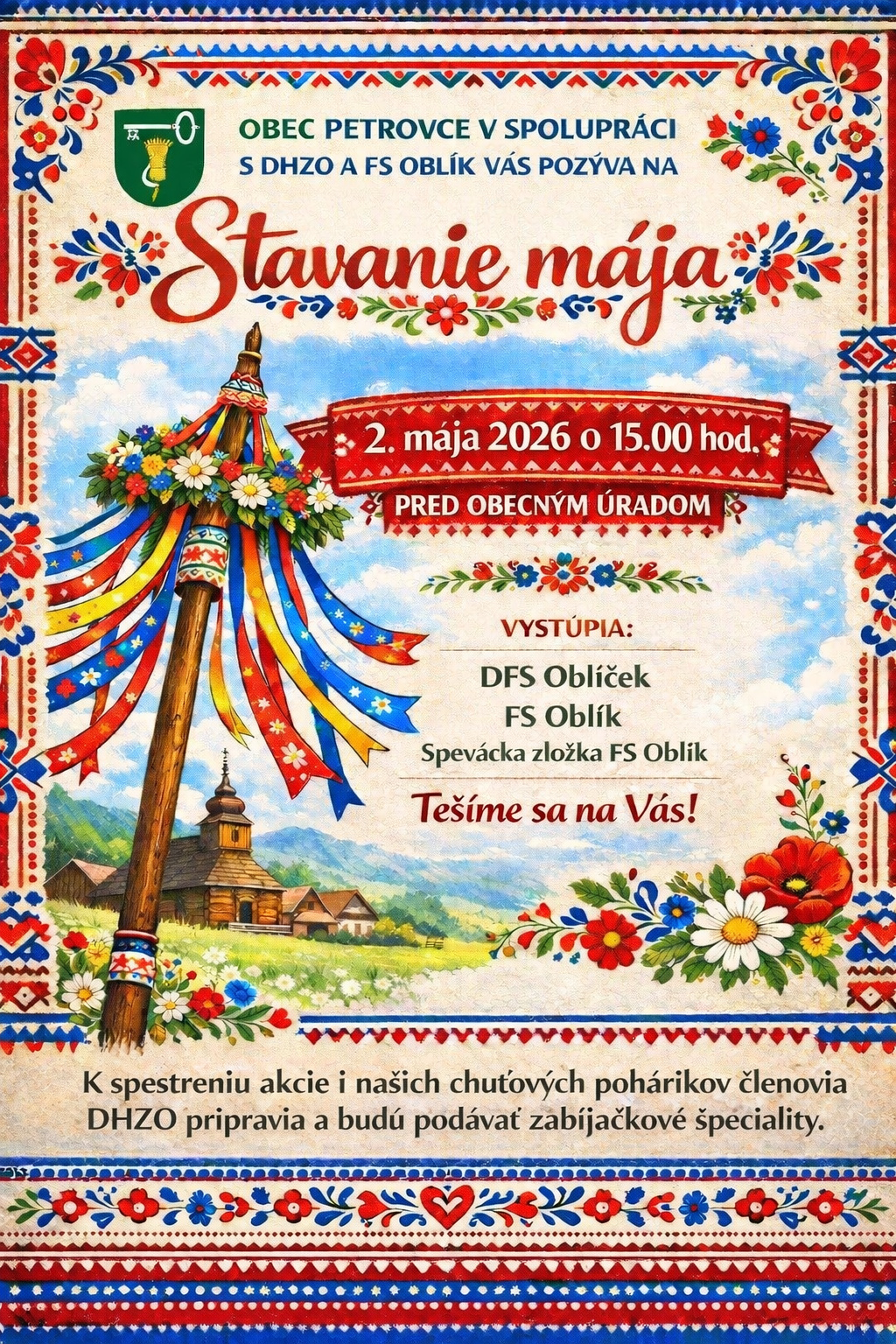 srdečne vás pozývame na tradičné stavanie mája, ktoré sa uskutoční v našej obci. Príďte spolu s nami privítať jar, oživiť krásne zvyky a stráviť príjemné chvíle v spoločnosti rodiny, priateľov a susedov.